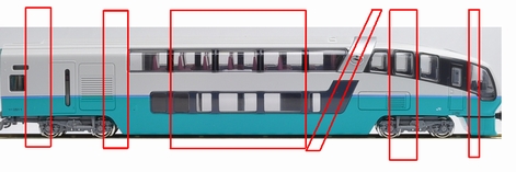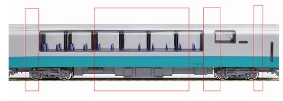 どう見ても、台車の間隔がBトレではない。でも、BトレのE233系の2階建て車を見てみると、
